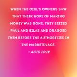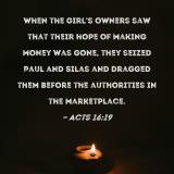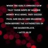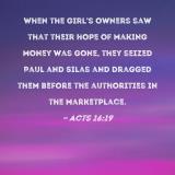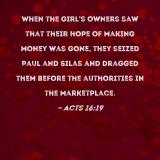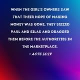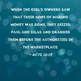 When the girl's owners saw that their hope of making money was gone, they seized Paul and Silas and dragged them before the authorities in the marketplace.