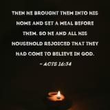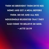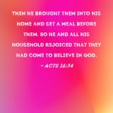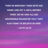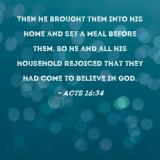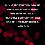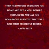 Then he brought them into his home and set a meal before them. So he and all his household rejoiced that they had come to believe in God.