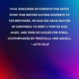 Paul remained in Corinth for quite some time before saying goodbye to the brothers. He had his head shaved in Cenchrea to keep a vow he had made, and then he sailed for Syria, accompanied by Priscilla and Aquila.