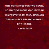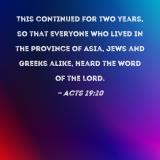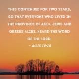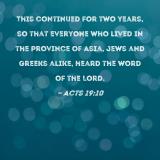 This continued for two years, so that everyone who lived in the province of Asia, Jews and Greeks alike, heard the word of the Lord.