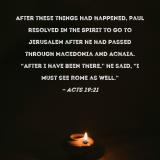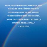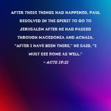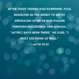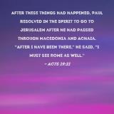 After these things had happened, Paul resolved in the Spirit to go to Jerusalem after he had passed through Macedonia and Achaia. "After I have been there," he said, "I must see Rome as well."
