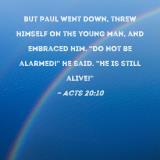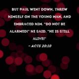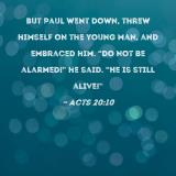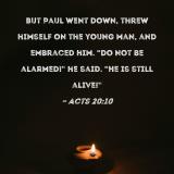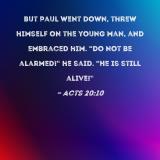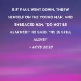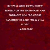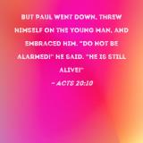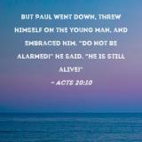 But Paul went down, threw himself on the young man, and embraced him. "Do not be alarmed!" he said. "He is still alive!"