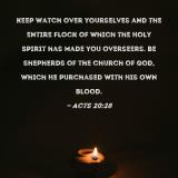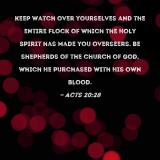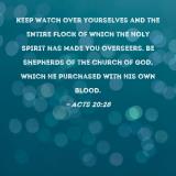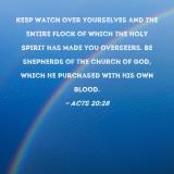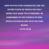 Keep watch over yourselves and the entire flock of which the Holy Spirit has made you overseers. Be shepherds of the church of God, which He purchased with His own blood.