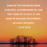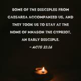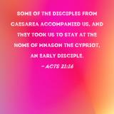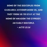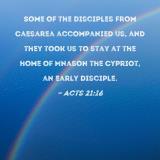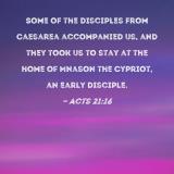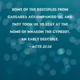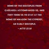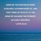 Some of the disciples from Caesarea accompanied us, and they took us to stay at the home of Mnason the Cypriot, an early disciple.