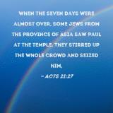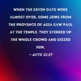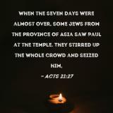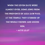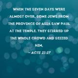 When the seven days were almost over, some Jews from the province of Asia saw Paul at the temple. They stirred up the whole crowd and seized him,