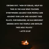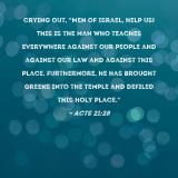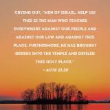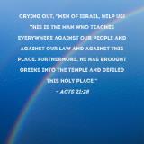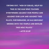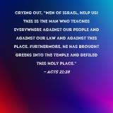 crying out, "Men of Israel, help us! This is the man who teaches everywhere against our people and against our law and against this place. Furthermore, he has brought Greeks into the temple and defiled this holy place."