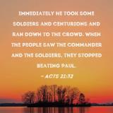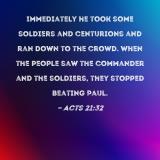 Immediately he took some soldiers and centurions and ran down to the crowd. When the people saw the commander and the soldiers, they stopped beating Paul.