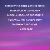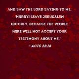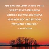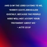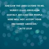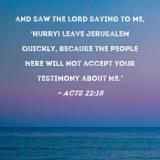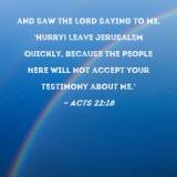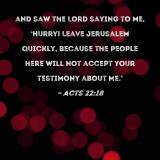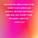 and saw the Lord saying to me, 'Hurry! Leave Jerusalem quickly, because the people here will not accept your testimony about Me.'