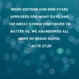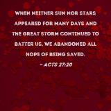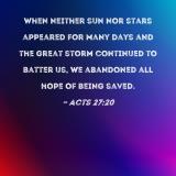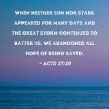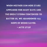 When neither sun nor stars appeared for many days and the great storm continued to batter us, we abandoned all hope of being saved.