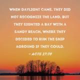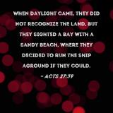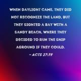 When daylight came, they did not recognize the land, but they sighted a bay with a sandy beach, where they decided to run the ship aground if they could.