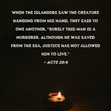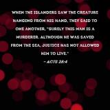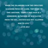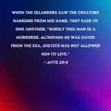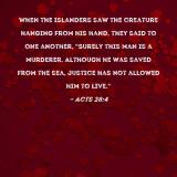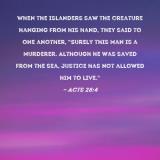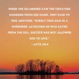When the islanders saw the creature hanging from his hand, they said to one another, "Surely this man is a murderer. Although he was saved from the sea, Justice has not allowed him to live."
