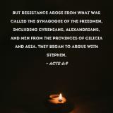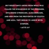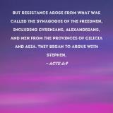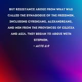 But resistance arose from what was called the Synagogue of the Freedmen, including Cyrenians, Alexandrians, and men from the provinces of Cilicia and Asia. They began to argue with Stephen,