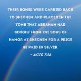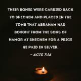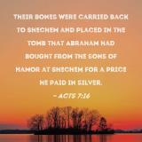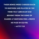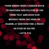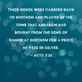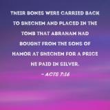 Their bones were carried back to Shechem and placed in the tomb that Abraham had bought from the sons of Hamor at Shechem for a price he paid in silver.