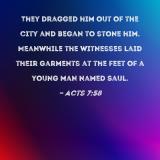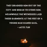 They dragged him out of the city and began to stone him. Meanwhile the witnesses laid their garments at the feet of a young man named Saul.