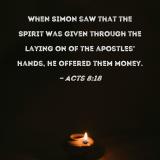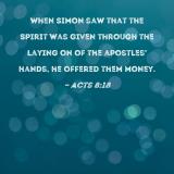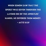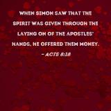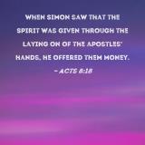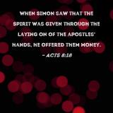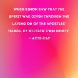 When Simon saw that the Spirit was given through the laying on of the apostles' hands, he offered them money.