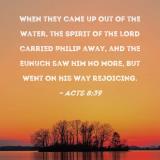 When they came up out of the water, the Spirit of the Lord carried Philip away, and the eunuch saw him no more, but went on his way rejoicing.