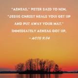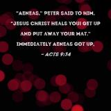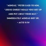 "Aeneas," Peter said to him, "Jesus Christ heals you! Get up and put away your mat." Immediately Aeneas got up,