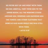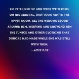 So Peter got up and went with them. On his arrival, they took him to the upper room. All the widows stood around him, weeping and showing him the tunics and other clothing that Dorcas had made while she was still with them.