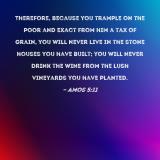 Therefore, because you trample on the poor and exact from him a tax of grain, you will never live in the stone houses you have built; you will never drink the wine from the lush vineyards you have planted.