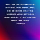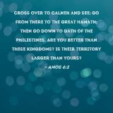 Cross over to Calneh and see; go from there to the great Hamath; then go down to Gath of the Philistines. Are you better than these kingdoms? Is their territory larger than yours?