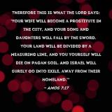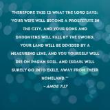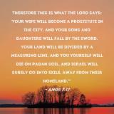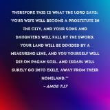 Pictures and Artwork Therefore this is what the LORD says: 'Your wife will become a prostitute in the city, and your sons and daughters will fall by the sword. Your land will be divided by a measuring line, and you yourself will die on pagan soil. And Israel will surely go into exile, away from their homeland.'" |