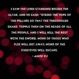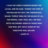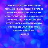 Pictures and Artwork I saw the Lord standing beside the altar, and He said: "Strike the tops of the pillars so that the thresholds shake. Topple them on the heads of all the people, and I will kill the rest with the sword. None of those who flee will get away; none of the fugitives will escape. |