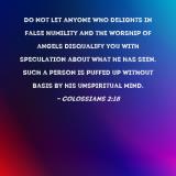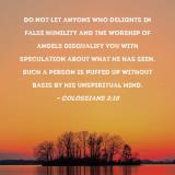 Do not let anyone who delights in false humility and the worship of angels disqualify you with speculation about what he has seen. Such a person is puffed up without basis by his unspiritual mind.
