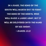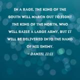 In a rage, the king of the South will march out to fight the king of the North, who will raise a large army, but it will be delivered into the hand of his enemy.