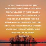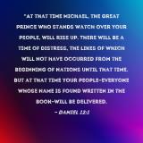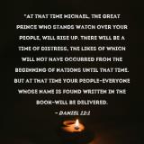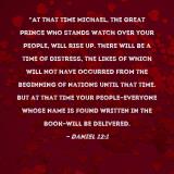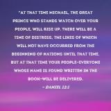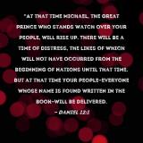 Pictures and Artwork "At that time Michael, the great prince who stands watch over your people, will rise up. There will be a time of distress, the likes of which will not have occurred from the beginning of nations until that time. But at that time your people--everyone whose name is found written in the book--will be delivered. |