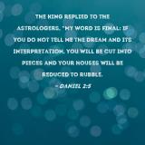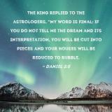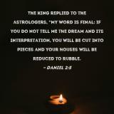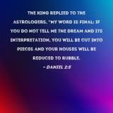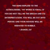 The king replied to the astrologers, "My word is final: If you do not tell me the dream and its interpretation, you will be cut into pieces and your houses will be reduced to rubble.