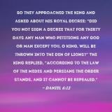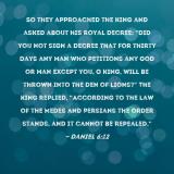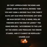 Pictures and Artwork So they approached the king and asked about his royal decree: "Did you not sign a decree that for thirty days any man who petitions any god or man except you, O king, will be thrown into the den of lions?" The king replied, "According to the law of the Medes and Persians the order stands, and it cannot be repealed." |