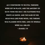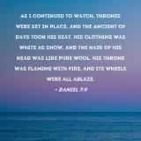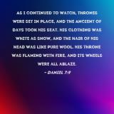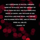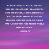 Pictures and Artwork As I continued to watch, thrones were set in place, and the Ancient of Days took His seat. His clothing was white as snow, and the hair of His head was like pure wool. His throne was flaming with fire, and its wheels were all ablaze. |