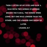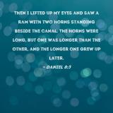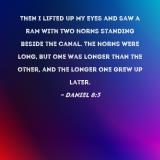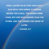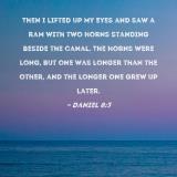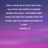 Then I lifted up my eyes and saw a ram with two horns standing beside the canal. The horns were long, but one was longer than the other, and the longer one grew up later.