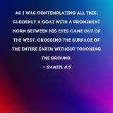 As I was contemplating all this, suddenly a goat with a prominent horn between his eyes came out of the west, crossing the surface of the entire earth without touching the ground.