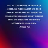 Just as it is written in the Law of Moses, all this disaster has come upon us, yet we have not sought the favor of the LORD our God by turning from our iniquities and giving attention to Your truth.