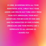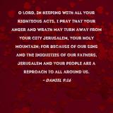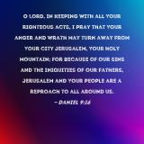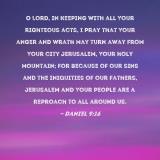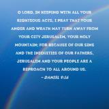 Pictures and Artwork O Lord, in keeping with all Your righteous acts, I pray that Your anger and wrath may turn away from Your city Jerusalem, Your holy mountain; for because of our sins and the iniquities of our fathers, Jerusalem and Your people are a reproach to all around us. |