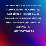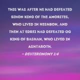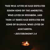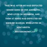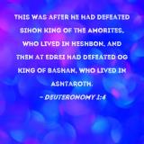 This was after he had defeated Sihon king of the Amorites, who lived in Heshbon, and then at Edrei had defeated Og king of Bashan, who lived in Ashtaroth.