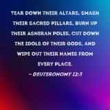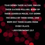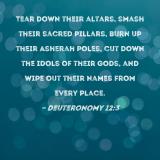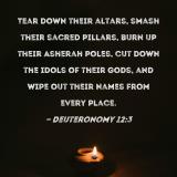 Tear down their altars, smash their sacred pillars, burn up their Asherah poles, cut down the idols of their gods, and wipe out their names from every place.