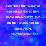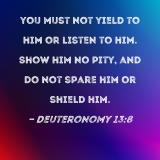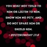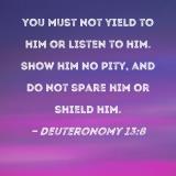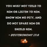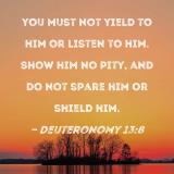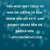 you must not yield to him or listen to him. Show him no pity, and do not spare him or shield him.
