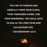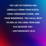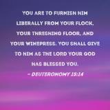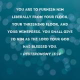 You are to furnish him liberally from your flock, your threshing floor, and your winepress. You shall give to him as the LORD your God has blessed you.