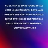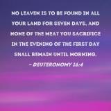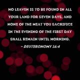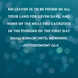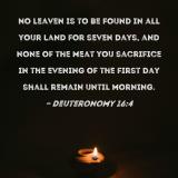 No leaven is to be found in all your land for seven days, and none of the meat you sacrifice in the evening of the first day shall remain until morning.