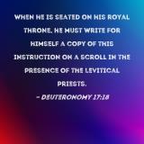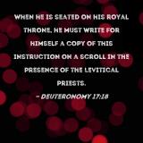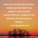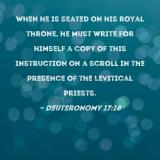When he is seated on his royal throne, he must write for himself a copy of this instruction on a scroll in the presence of the Levitical priests.