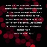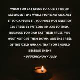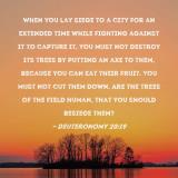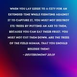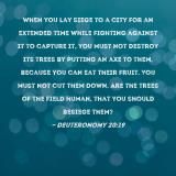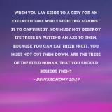 Pictures and Artwork When you lay siege to a city for an extended time while fighting against it to capture it, you must not destroy its trees by putting an axe to them, because you can eat their fruit. You must not cut them down. Are the trees of the field human, that you should besiege them? |