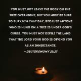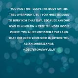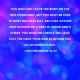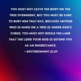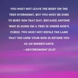 Pictures and Artwork you must not leave the body on the tree overnight, but you must be sure to bury him that day, because anyone who is hung on a tree is under God's curse. You must not defile the land that the LORD your God is giving you as an inheritance. |