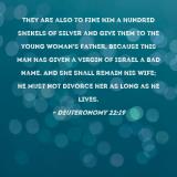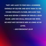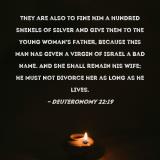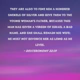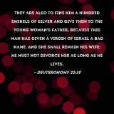Pictures and Artwork They are also to fine him a hundred shekels of silver and give them to the young woman's father, because this man has given a virgin of Israel a bad name. And she shall remain his wife; he must not divorce her as long as he lives. |