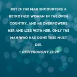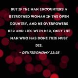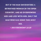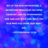 But if the man encounters a betrothed woman in the open country, and he overpowers her and lies with her, only the man who has done this must die.