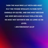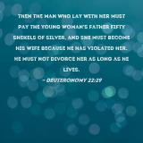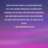 then the man who lay with her must pay the young woman's father fifty shekels of silver, and she must become his wife because he has violated her. He must not divorce her as long as he lives.