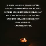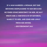 If a man marries a woman, but she becomes displeasing to him because he finds some indecency in her, he may write her a certificate of divorce, hand it to her, and send her away from his house.