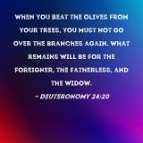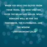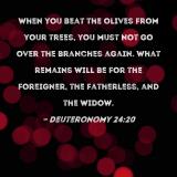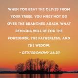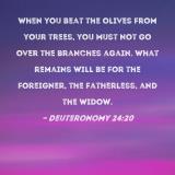 When you beat the olives from your trees, you must not go over the branches again. What remains will be for the foreigner, the fatherless, and the widow.