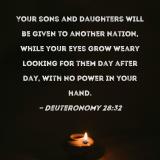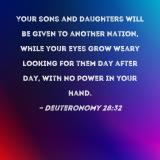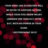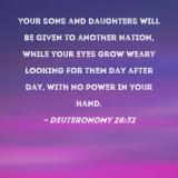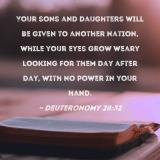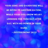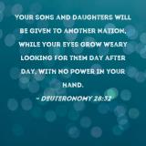 Your sons and daughters will be given to another nation, while your eyes grow weary looking for them day after day, with no power in your hand.